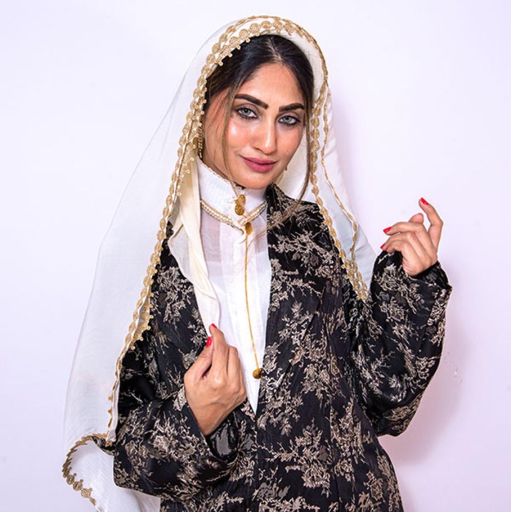 • الطرحة: شيفون أبيض مزين بحواف ذهبية تراثية.