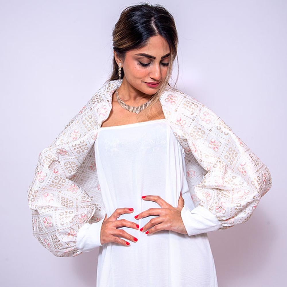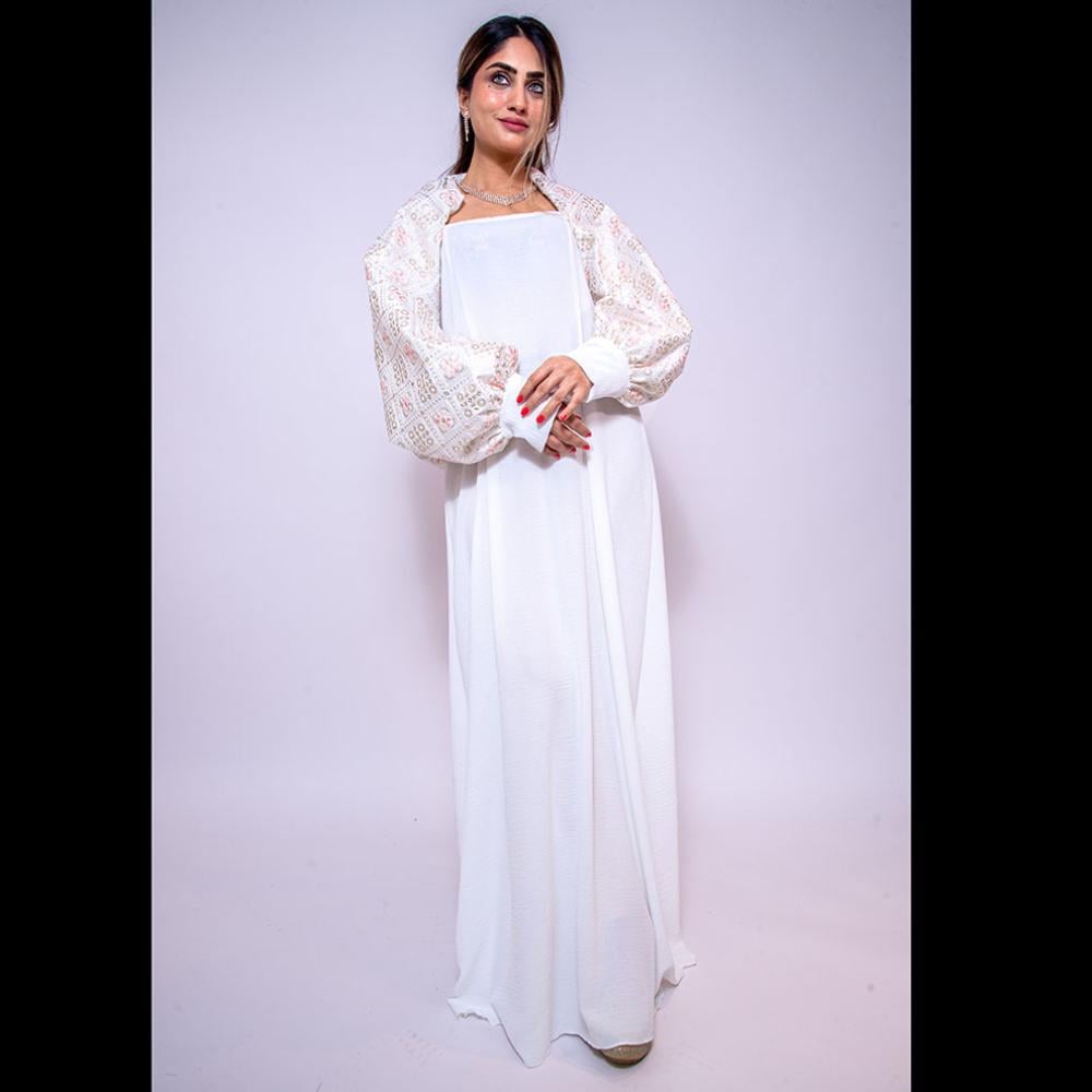 - الأكمام الطويلة والمنتفخة تضفي لمسة من الرقي والأنوثة، كما أن الأسورة البيضاء المشدودة في نهايتها تضيف تفاصيل أنيقة تبرز جمال الفستان.