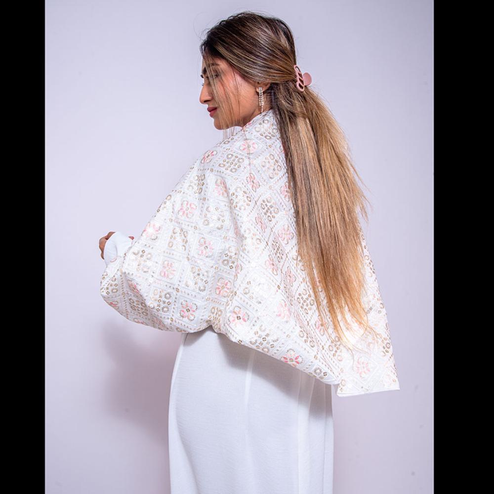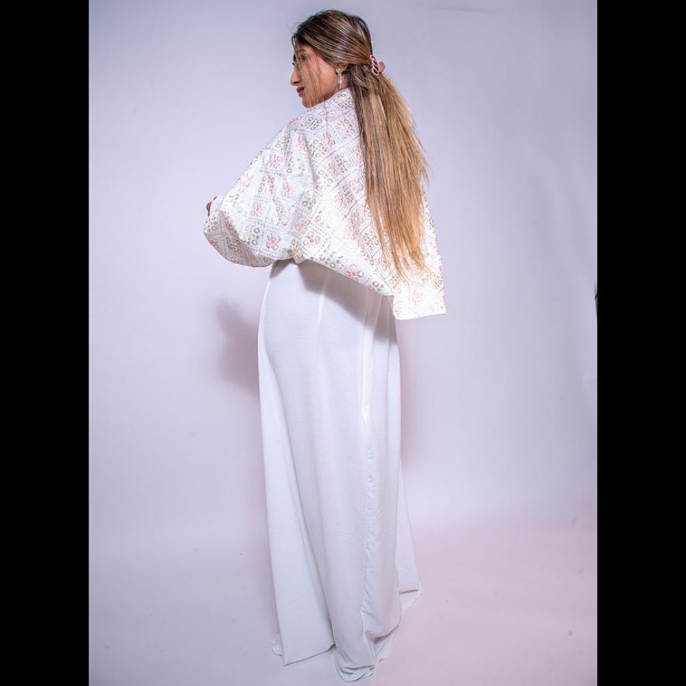 - الجزء العلوي مزين بقطعة (شبه بوليرو) بأكمام واسعة.