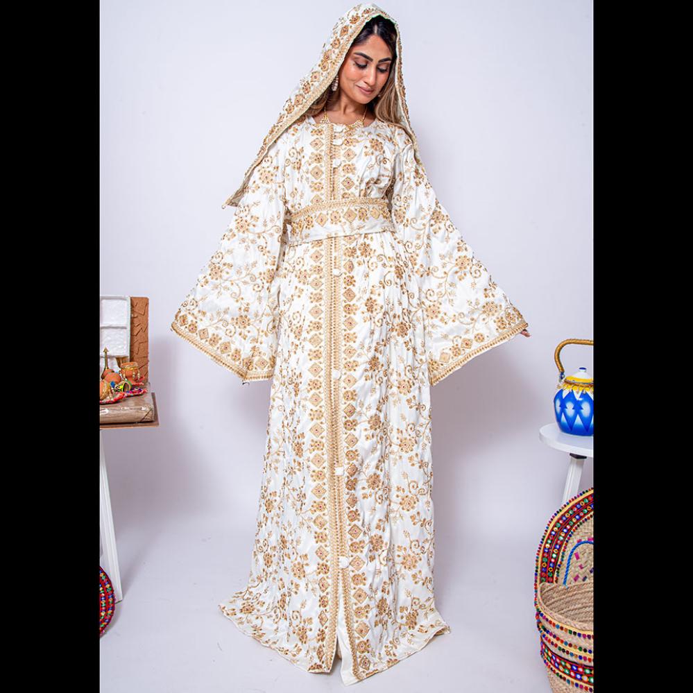 • يمتاز الفستان بتصميم فضفاض يمتد حتى الأرض، مع أكمام واسعة تمنح مظهرًا ملكيًا مريحًا. التصميم الكلاسيكي يعكس الأناقة والتراث في آن واحد.