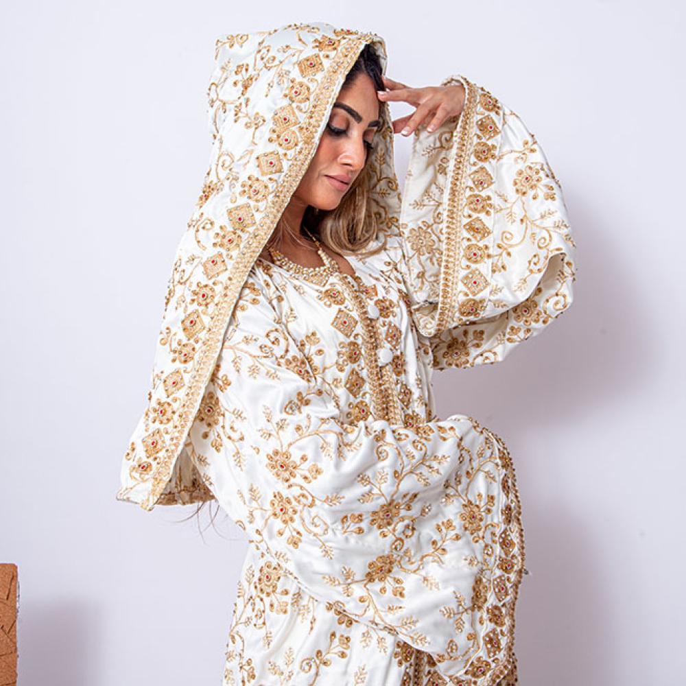 • التصميم: مطرز بالخيوط الذهبية والفصوص مناسب للغمره.