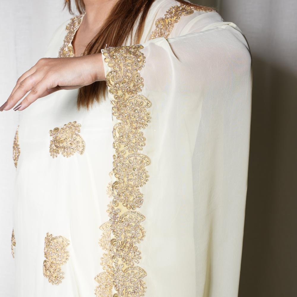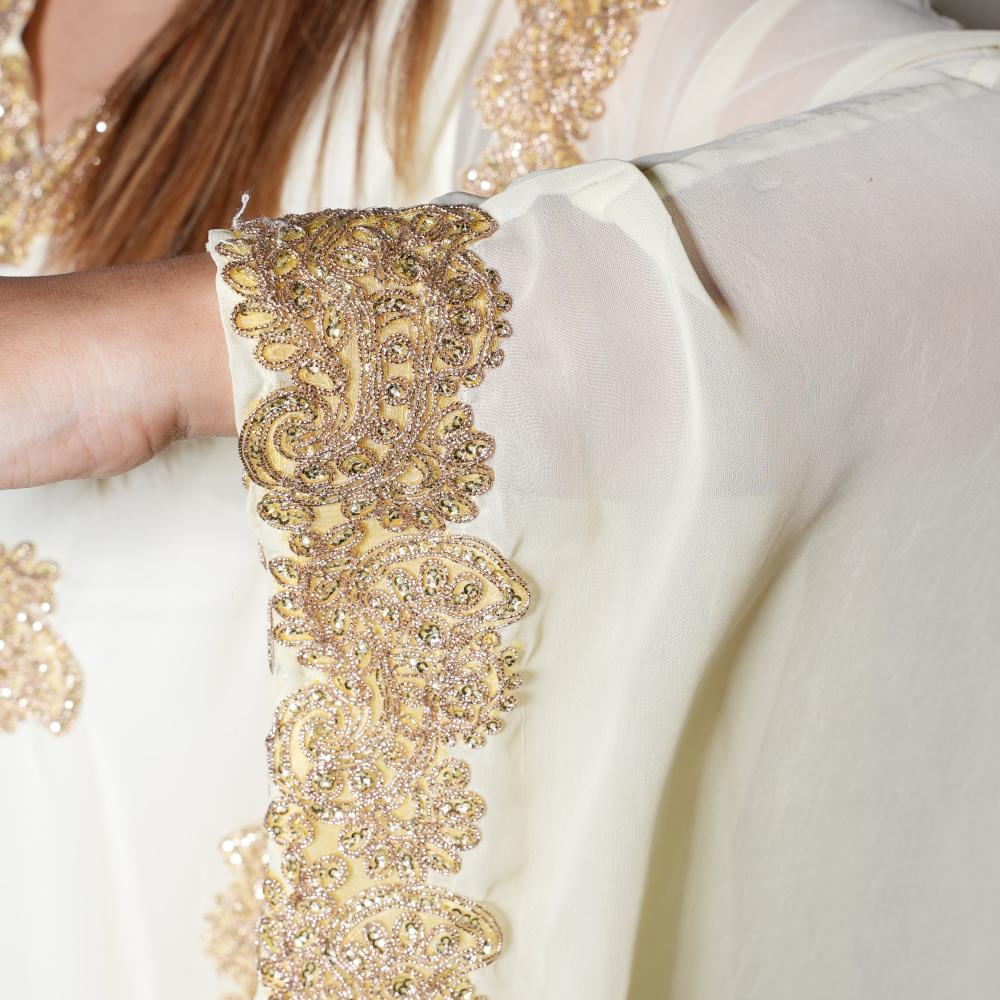 - التطريز: مزين بكلفة بخطوط رفيعة وفصوص لامعة على الأطراف والأكمام.
