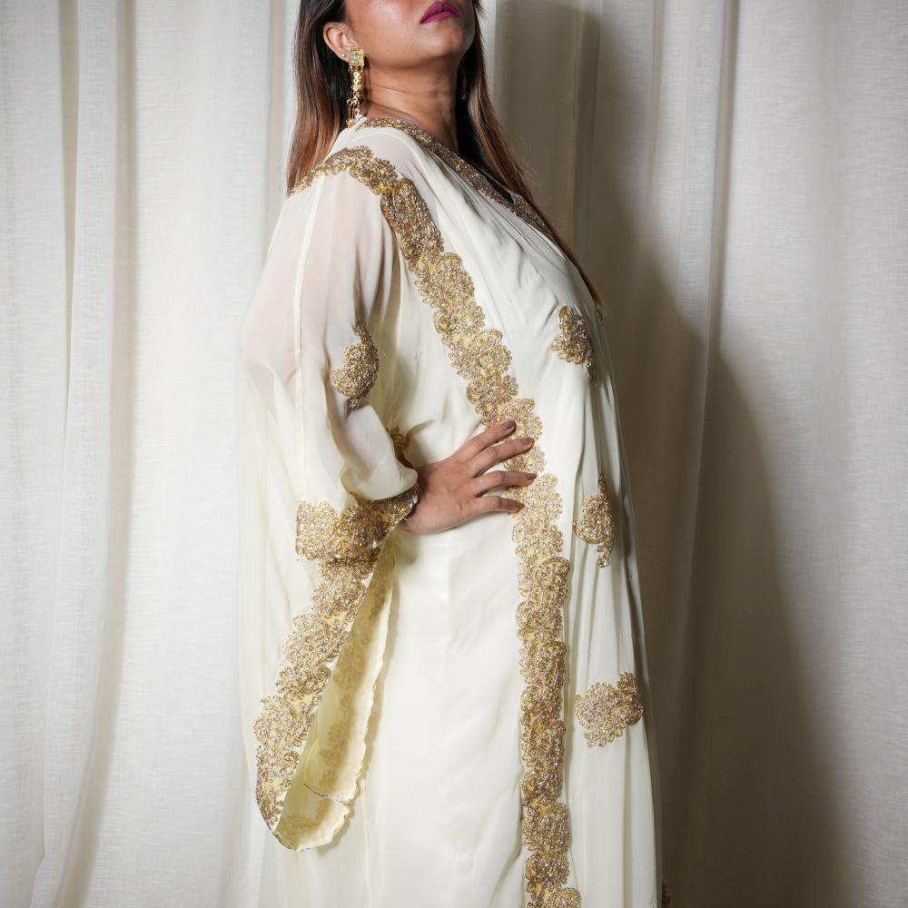 - مزين بكلفة أنيقة وفصوص لامعة على الأطراف والأكمام، ما يضفي لمسة ساحرة تزيد من جاذبيته.
