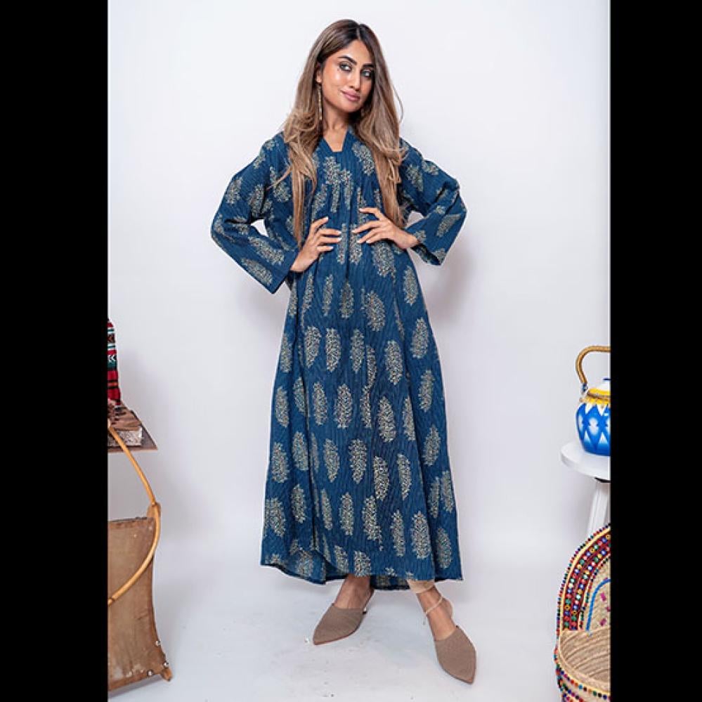 • يتميز الفستان الكحلي المنقوش بقصّة فضفاضة وغير محددة للجسم، ما يجعله مثاليًا لمن تبحث عن الراحة والأناقة. يمكن ارتداؤه في الإطلالات اليومية أو حتى المناسبات.