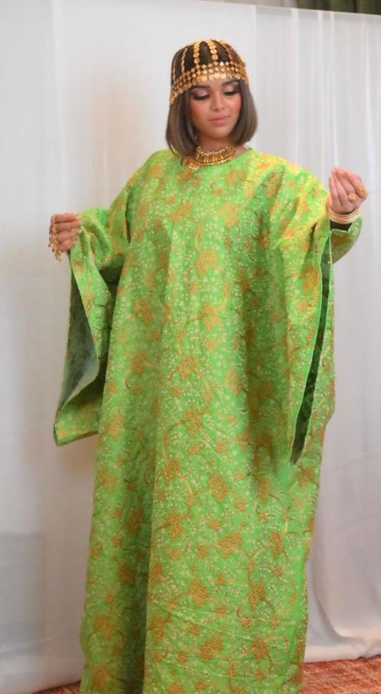 - الخامة: قماش عشبي فاخر مطرز بخيوط الكنتيل الذهبية.