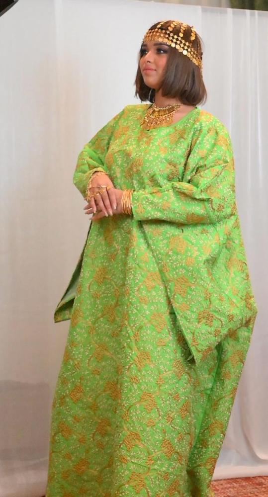 - يُستخدم قماش عشبي اللون مزدان بتطريزات الكنتيل الذهبية، ما يعكس تناغمًا بين البساطة والفخامة، ويُبرز الذوق التراثي بتفاصيل متقنة وجذابة.