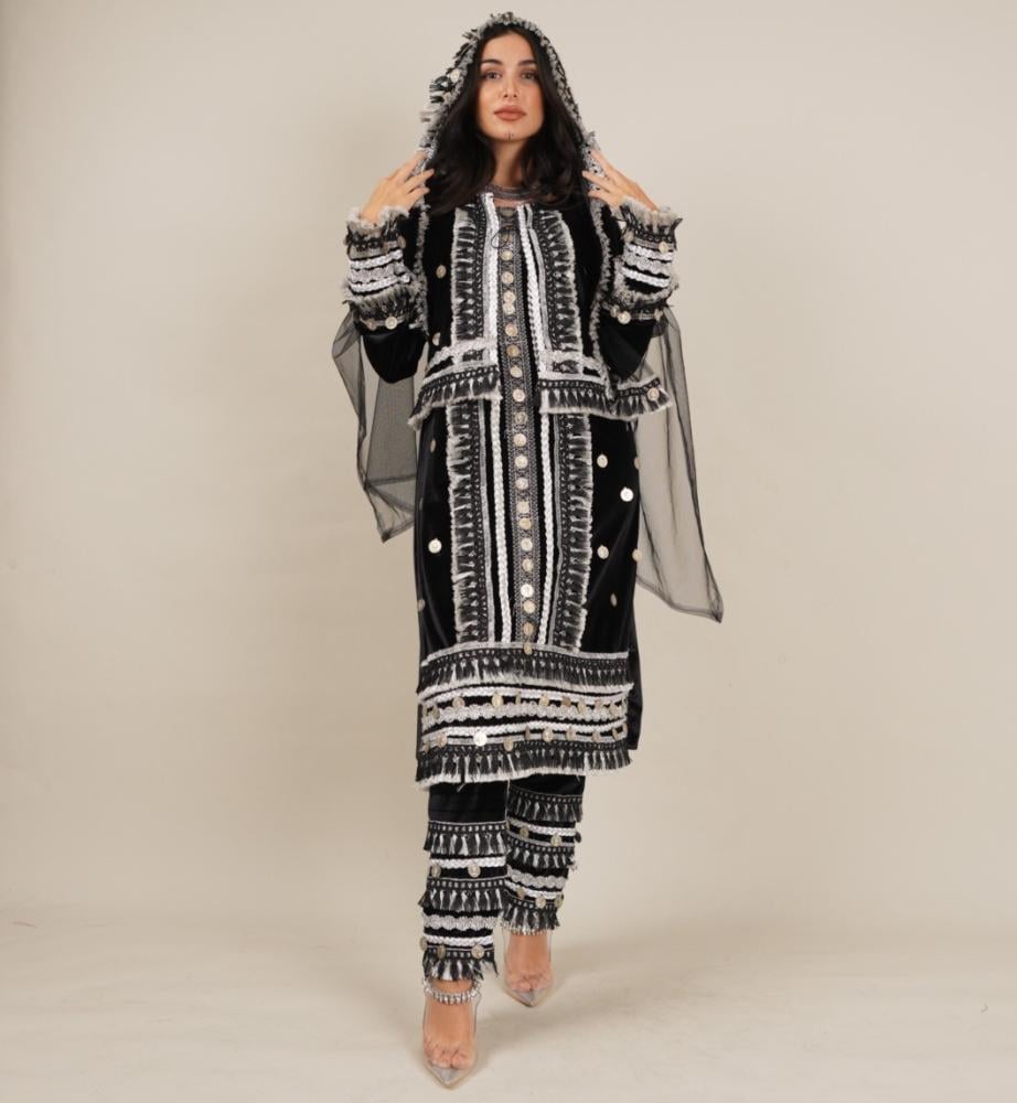 - اللون: أسود مطعّم بالتطريزات الفضية.