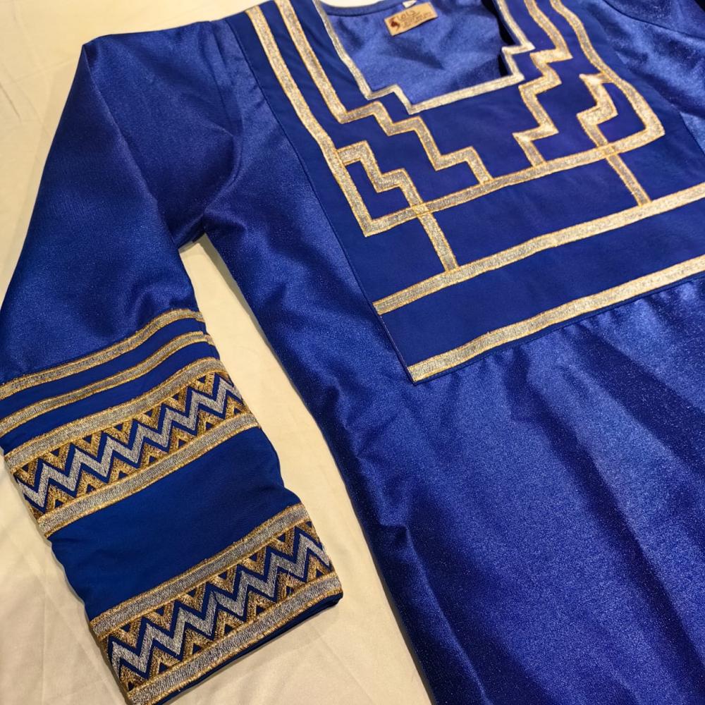 - تكتمل أناقة اللباس بتفاصيل راقية على الأكمام والسروال، حيث تزين الحواف بخطوط ذهبية وفضية، والتي تضيف لمسة من الفخامة والتألق تناسب الاحتفالات والمناسبات الراقية.