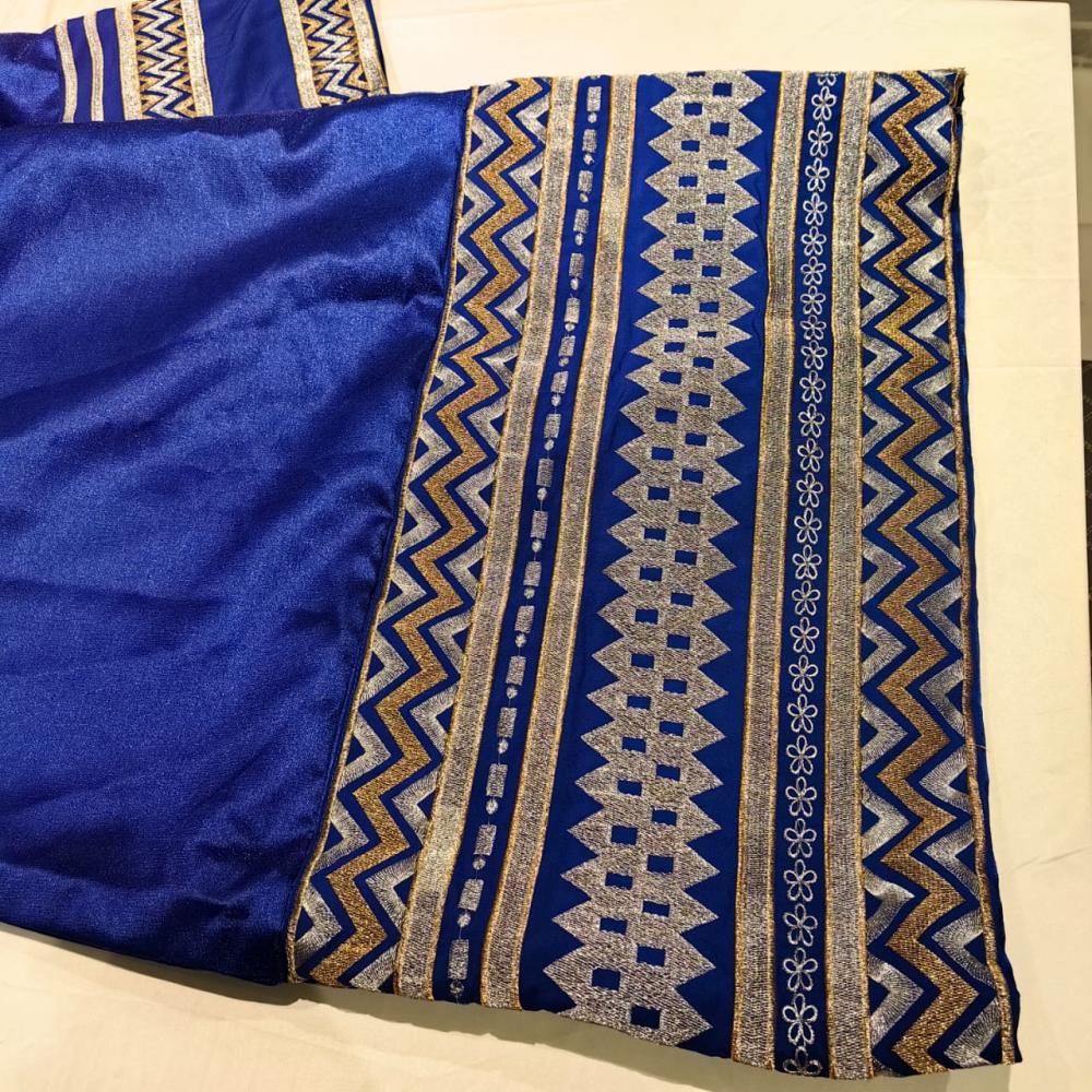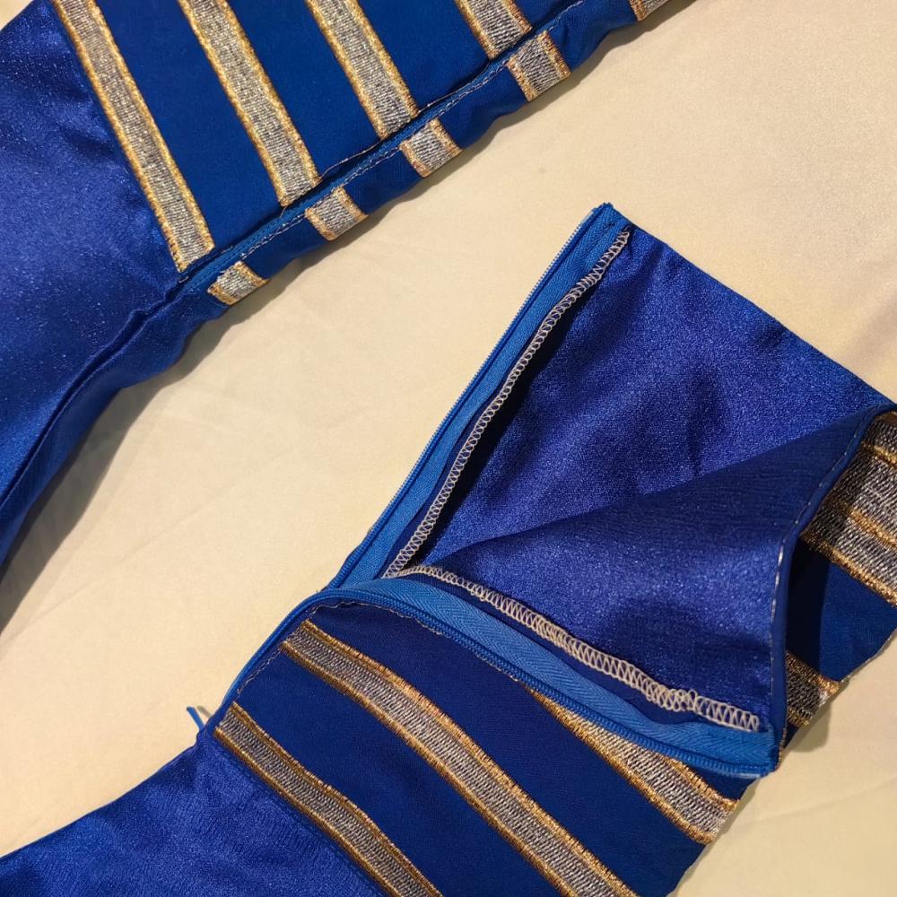 - حواف الأكمام والسروال مزينة بخطوط باللون الذهبي والفضي