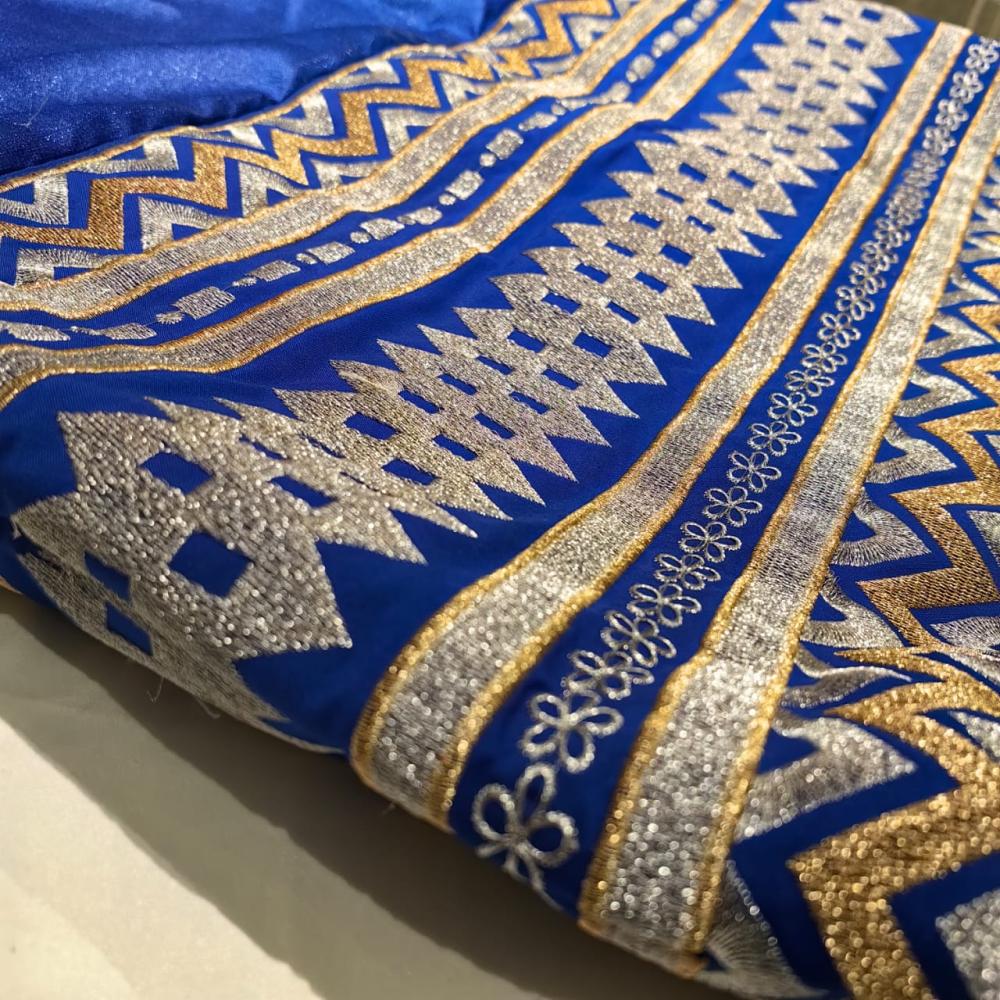 - مزين بتطريزات يدوية متقنة بإستخدام خيوط ذهبية وفضية، تعكس الفخامة والحرفية العالية.