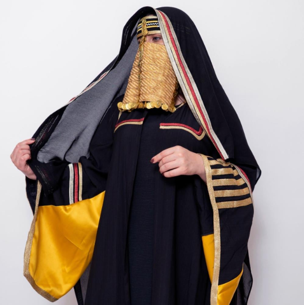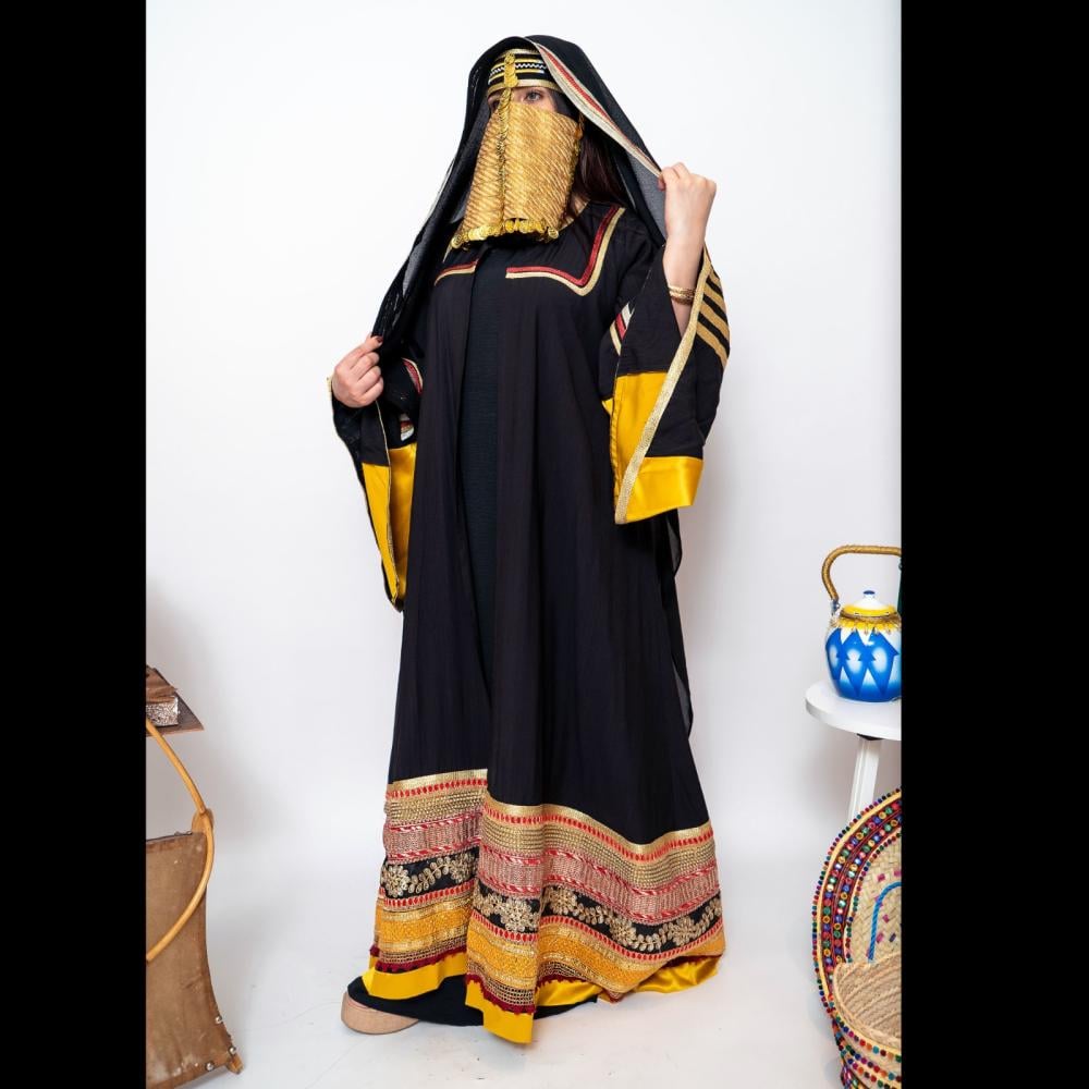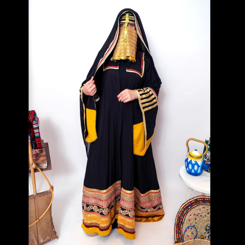 • يتكامل البرقع الذهبي مع الزي ليخلق مظهرًا فخمًا يعبر عن تاريخ غني، ويجذب الأنظار بتفاصيله المستوحاة من البيئة البدوية.
