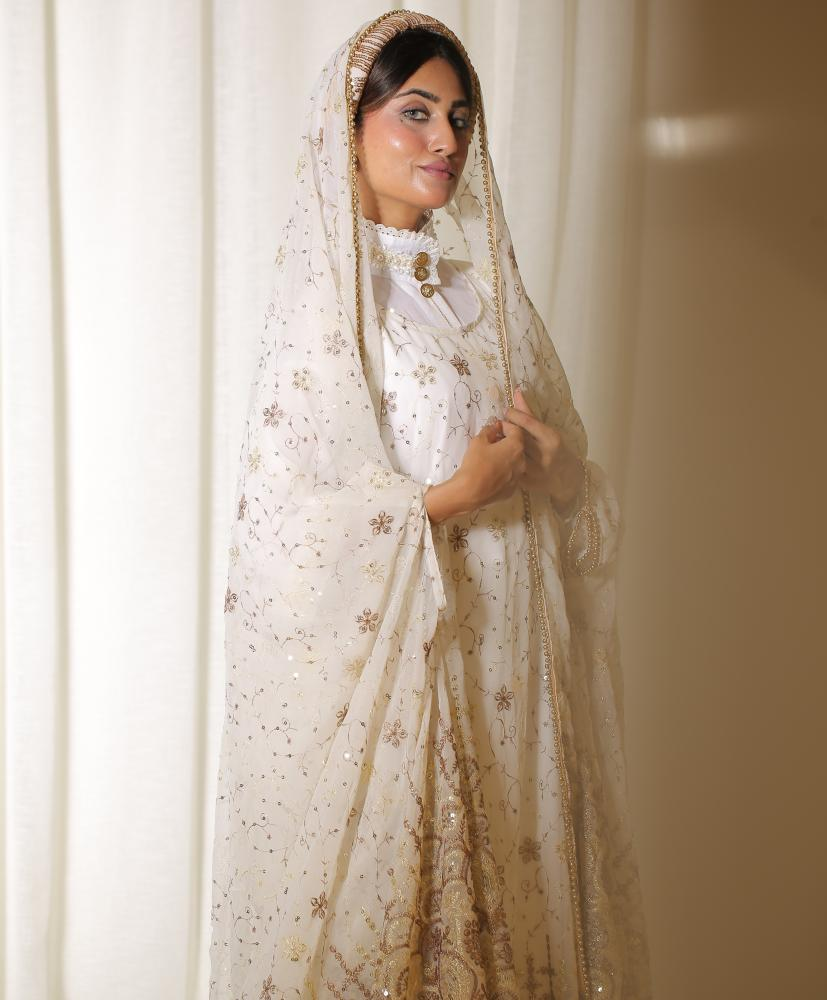 صُمم الثوب النجدي مع الطرحة خصيصًا لمناسبات الغمرة والاحتفالات ذات الطابع الفخم. يتميز بالتطريز الذهبي الدقيق الذي يضفي لمسة ملوكية راقية بينما يوفّر تصميمه الواسع والانسيابي راحة تامة خلال الحركة. أقمشته الناعمة وخفة التل تمنح إطلالة غنية بالتفاصيل البصرية دون أي عبء على الجسم.